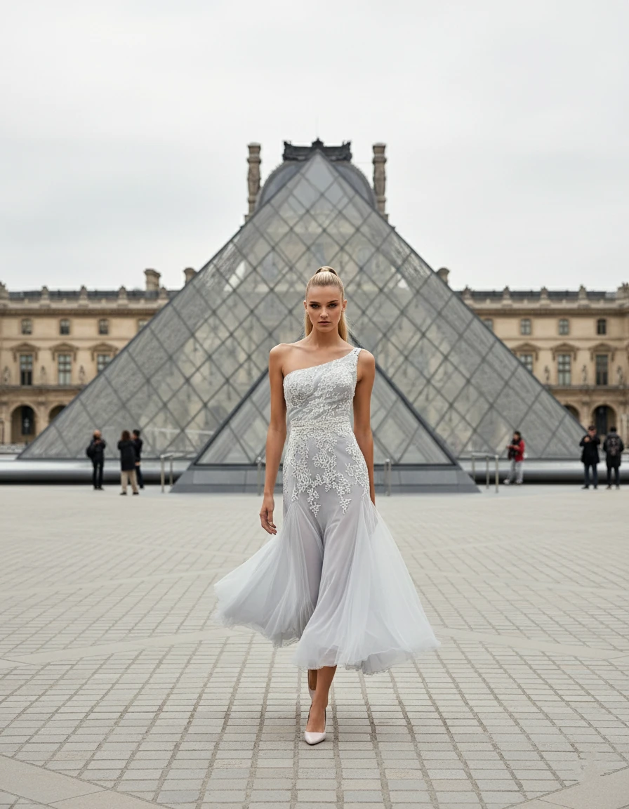 Το νυφικό πολιτικού γάμου δαντέλλα εκφράζει τη νέα αισθητική της σύγχρονης νύφης. Συνδυάζει την απλότητα με τη φινέτσα της παριζιάνικης κομψότητας. Επιπλέον, η φωτογράφηση μπροστά από το Λούβρο υπογραμμίζει τον καλλιτεχνικό του χαρακτήρα, καθώς η τέχνη, το φως και η αρχιτεκτονική συνδέονται αρμονικά με τη μόδα.